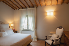 The two double bedrooms, located on the upper level, are designed with subtle elegance. Each features exposed wooden beams, soft neutral tones, and marble bathrooms, offering a serene and inviting retreat. Natural light and breathtaking views of Florence and the surrounding hills further enhance the experience.